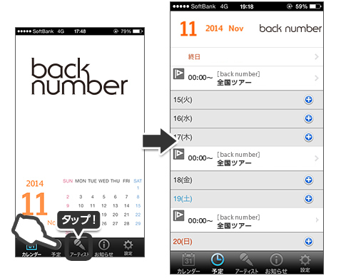 下部メニューの「アーティスト」を選択すると、アーティストだけの予定を確認することができます。カレンダーの日付をタップ、もしくは予定エリアをタップすると、その日の予定一覧が表示されます。
