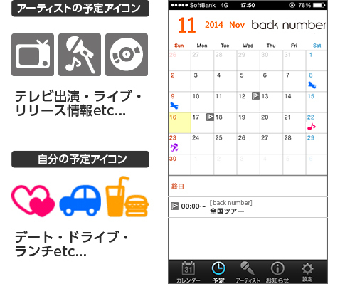 アーティストの予定と自分の予定を、1つのカレンダー上でチェック!