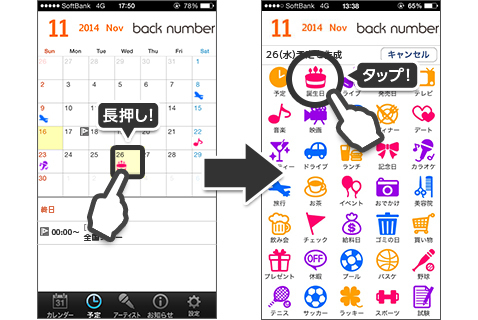 日付を長押しで、アイコンからカンタンに予定を作成!